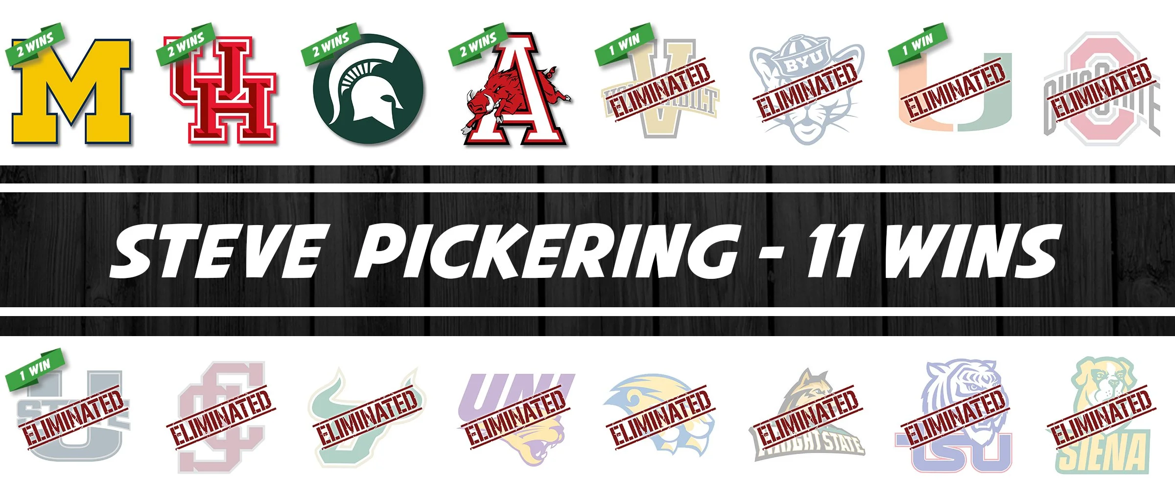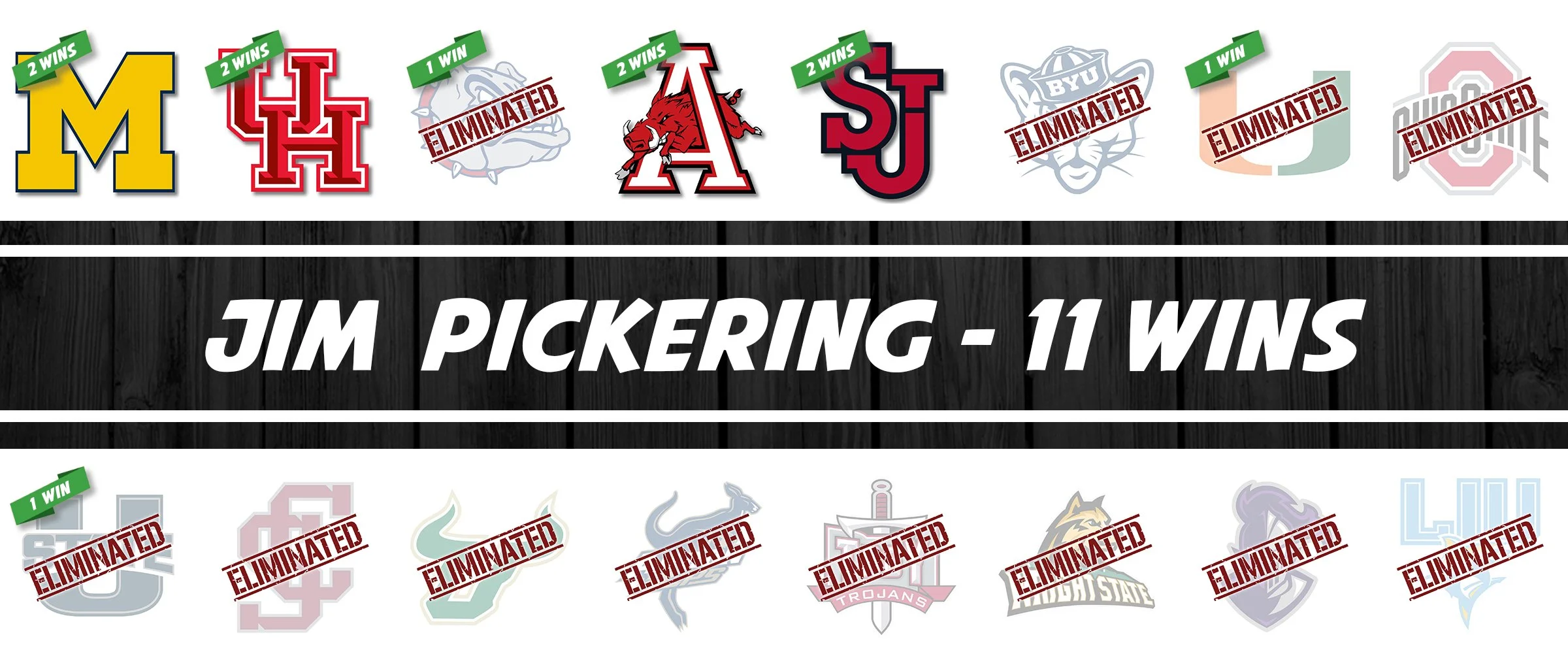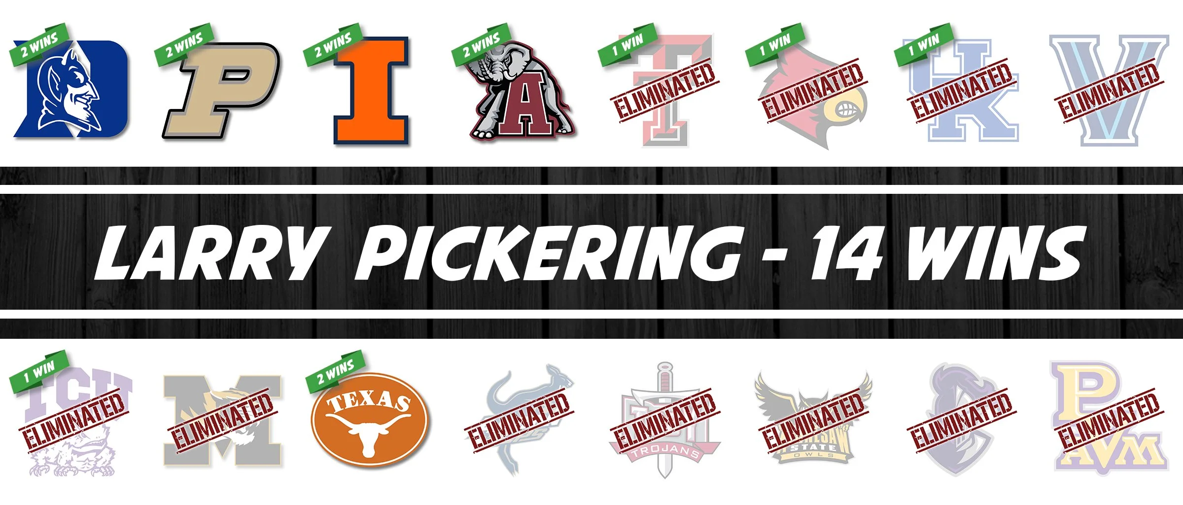 The Pickerings have flooded the market again. It worked out in the playoff fantasy football pool as Jim took that one down, but they are not having great luck with college hoops. 4 of them are in the bottom 7 of the league, and only Larry is in the top 10….coming in at #10 exactly. Not loving their chances getting any money, but love their enthusiasm.