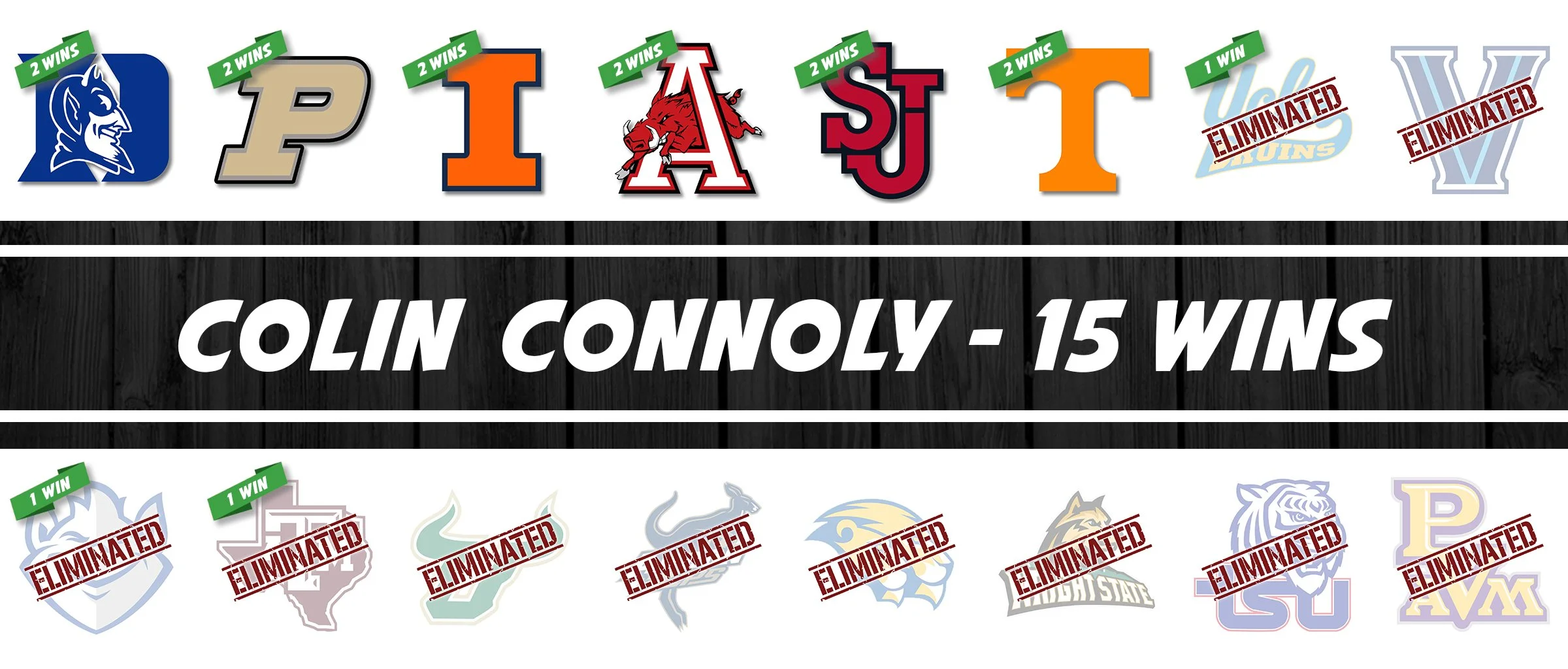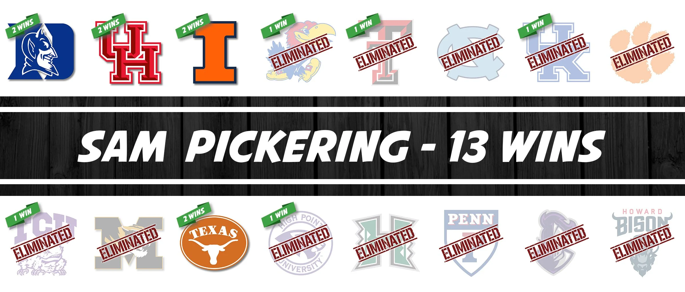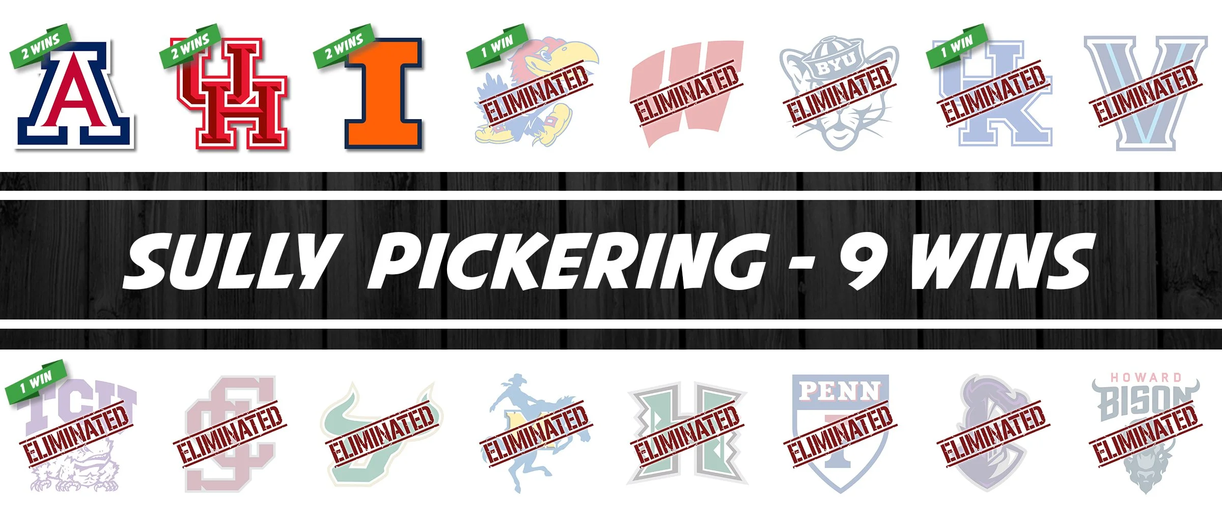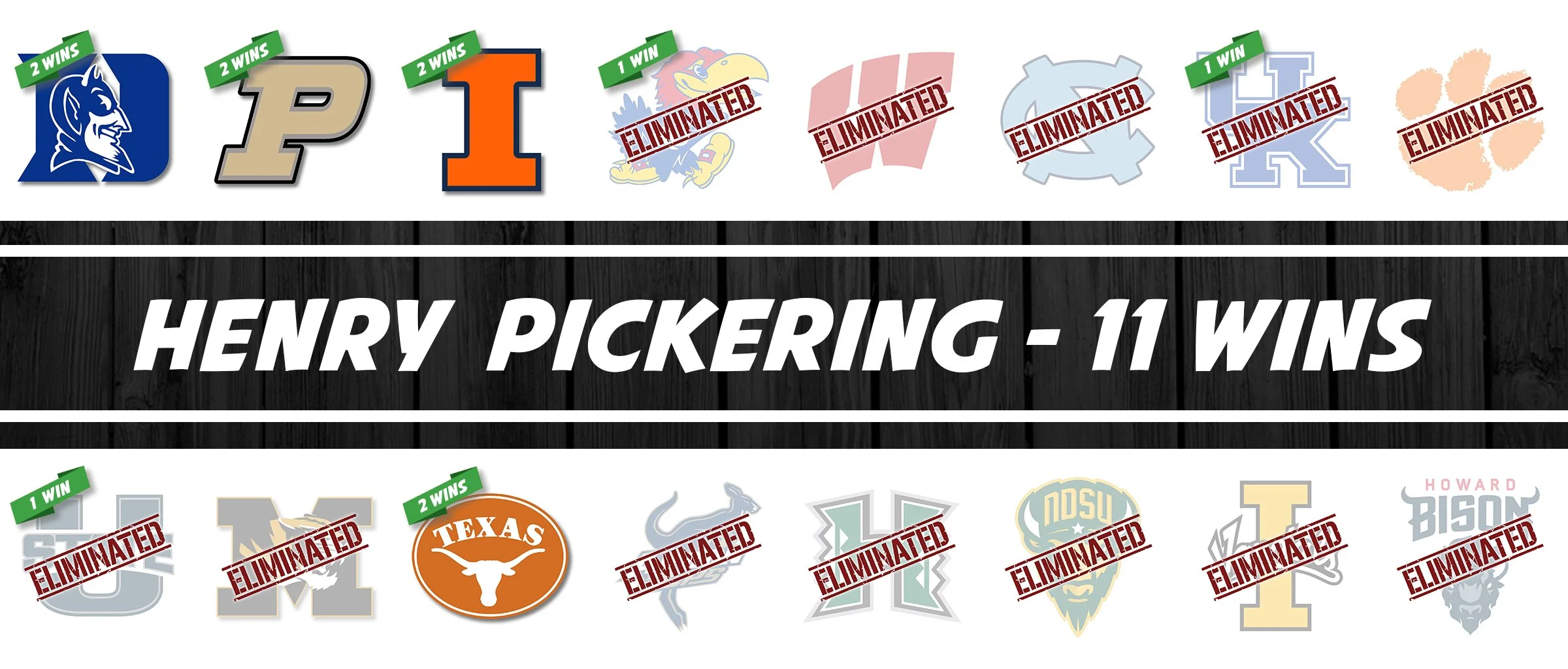 The Pickerings have flooded the market again. It worked out in the playoff fantasy football pool as Jim took that one down, but they are not having great luck with college hoops. 4 of them are in the bottom 7 of the league, and only Larry is in the top 10….coming in at #10 exactly. Not loving their chances getting any money, but love their enthusiasm.