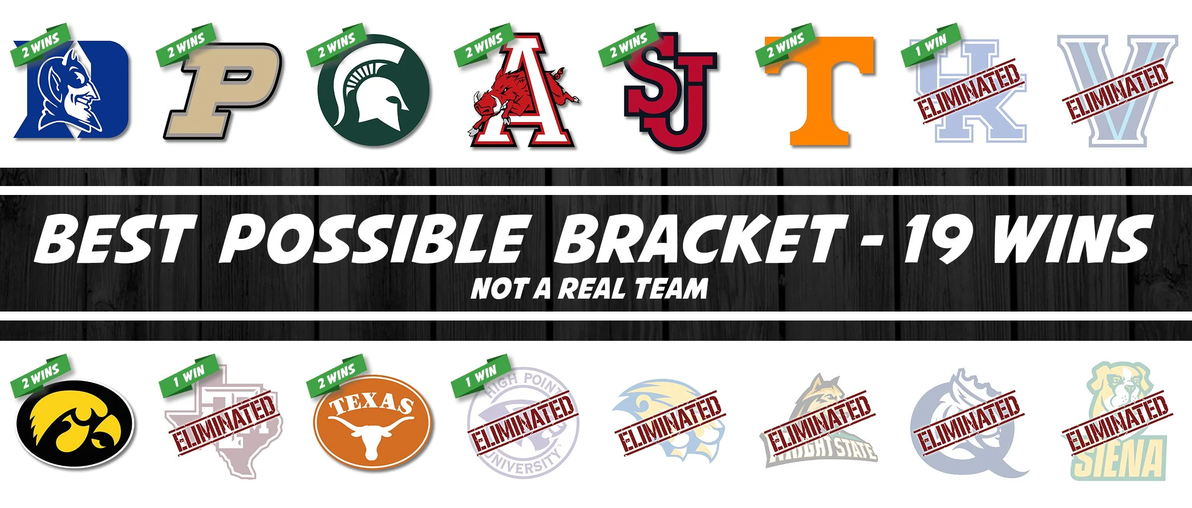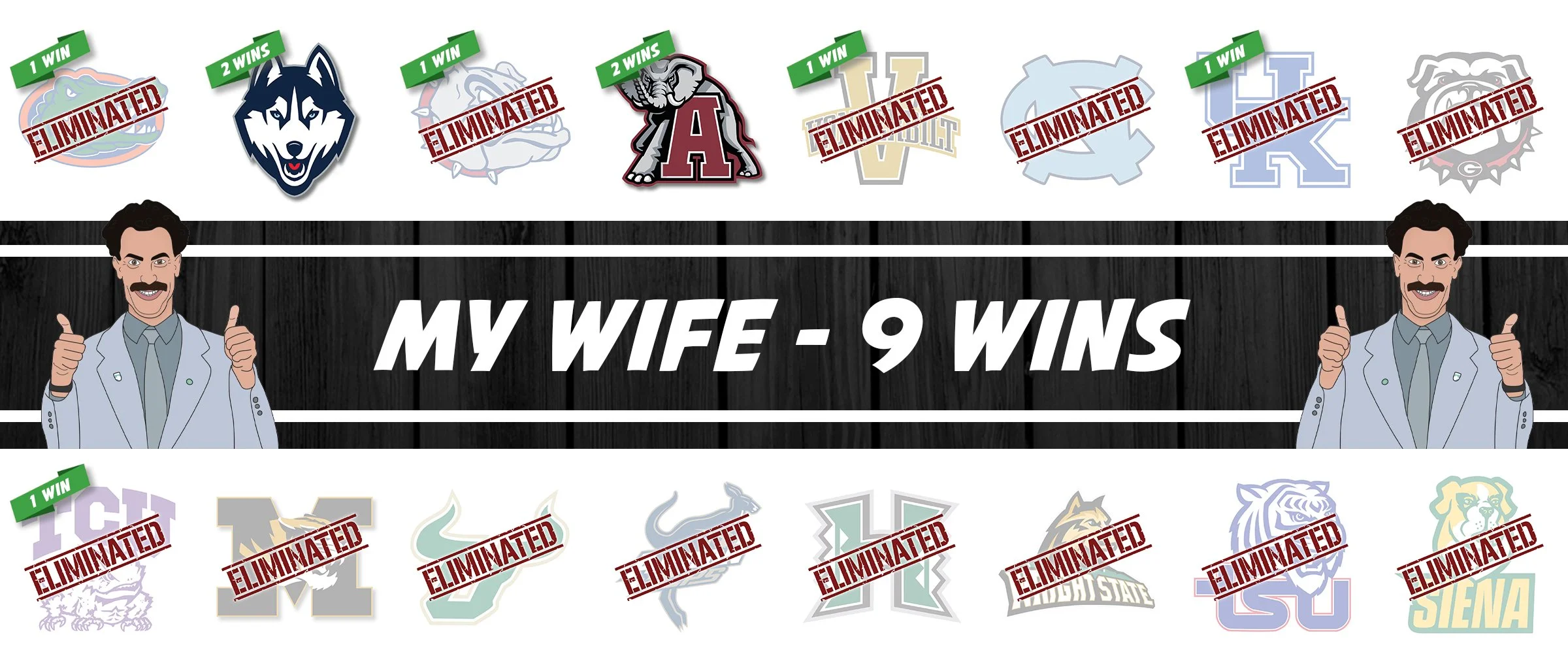 On the other end of the spectrum from Derek, is Jared. In his defense, his daughter selected his entire team based on logo prettiness and vibes. However, he has 7 wins, and the lowest total of wins a team could have at this point is 6. The only pick made that was not the absolute worst was taking Vanderbilt. They already lost, but Wisconsin lost a round earlier. I think next year we need to have his daughter submit her picks way in advance and then we head to draftkings and hedge the shit out of those bets. We would be swimming in money. Jess also used the method of letting a kindergartener pick the teams, and she only has 9 wins. I think none of us really know what the hell we are doing, but we are smarter than kindergartners, so well played everybody.