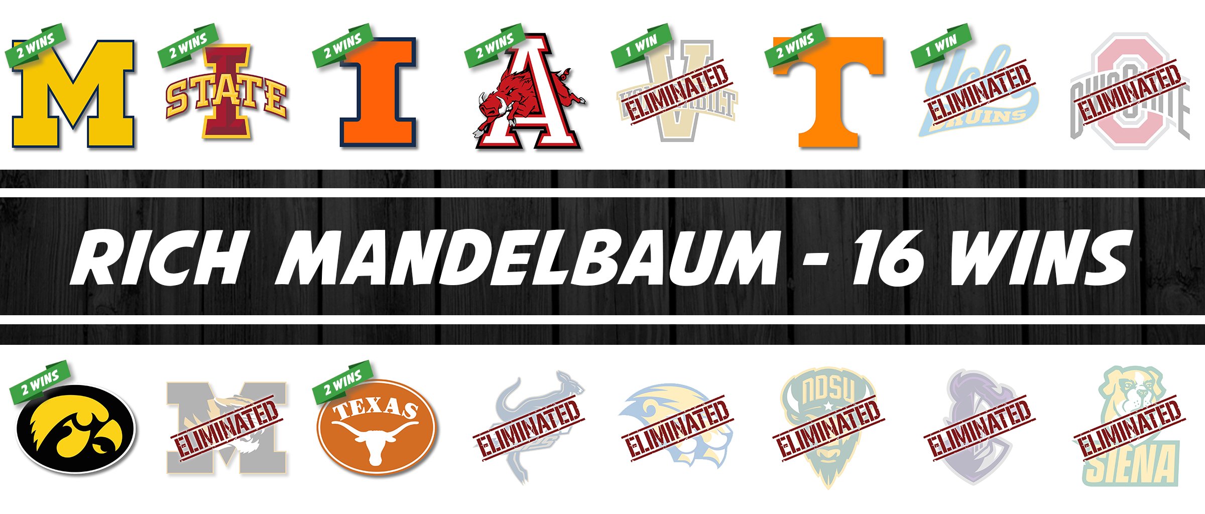 The first two rounds of March Madness are complete and we have had some excitement so far. I have said before that it is almost impossible to win Marks Madness before the Sweet 16, but you sure as hell can lose it. That saying is holding true this year, as there are many teams still in play for 1st place or a top-3 finish. There are also several teams that are already dead in the water. Take a look below to see how your doing and figure out which teams you have that will help you leap-frog over the people ahead of you.